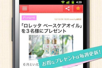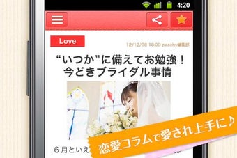 Peachy 女性向け総合ニュース コスメ~恋愛~レシピ情報は、文字の大きさ変更やお気に入り登録、共有機能がある、恋愛・ファッション・美容など女性向けニュースを配信している無料アプリです。